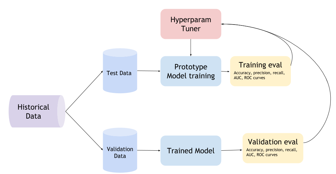 Results from the validation and training is fed back into the hyperparameter tuner to improve the performance of the model.